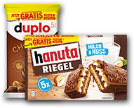 *Teilnehmende Packungen: duplo Chocnut 5er Packung & hanuta Riegel 5er Packung.