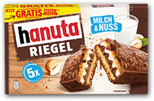 Im Rahmen unserer Aktion kann eine 5er-Aktionspackung hanuta Riegel und eine 5er-Aktionspackung duplo Chocnut gratis getestet werden, indem der gezahlte Kaufpreis zurückerstattet wird.